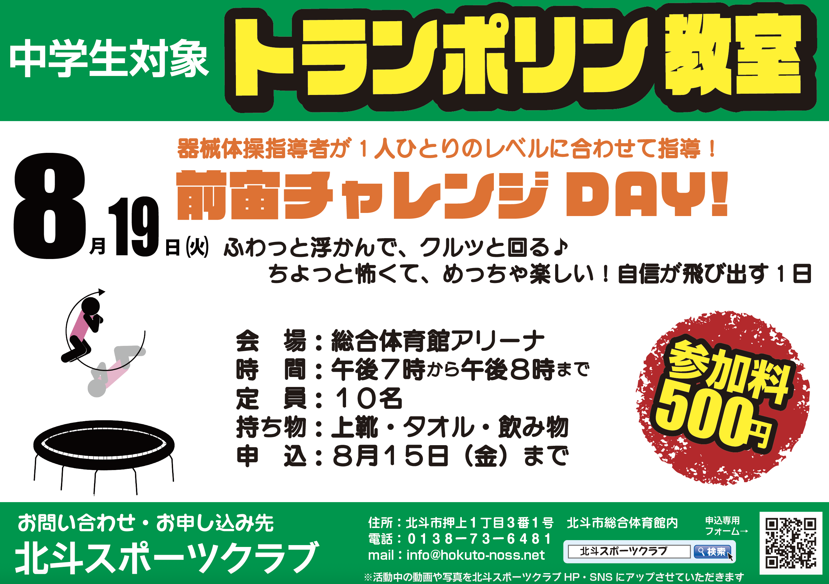 ■日 時:8月19日㈫ ■会 場:総合体育館 アリーナ ■時 間:午後7時から午後8時まで ■対 象:中学生 ■定 員:10名 ■申 込:8月15日㈮まで ■持ち物:上靴・タオル・飲み物 ■参加料:500円