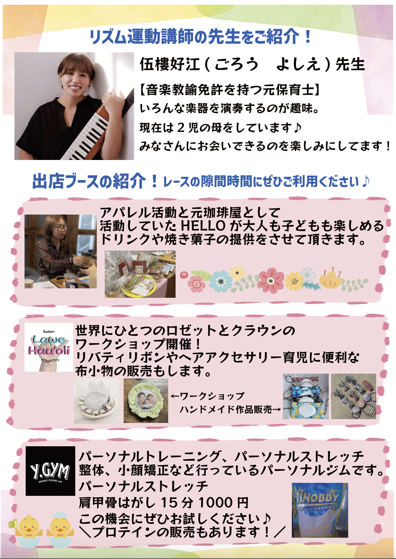 ハンドメイド用品の販売、家族写真を撮れるブースや、保護者の方もほっと一息できる整体やコーヒー、焼き菓子等の出店ブースもあります。