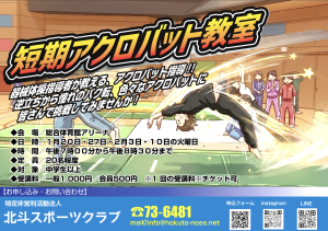 器械体操指導者が教える、アクロバット個別指導! 憧れのバク転やいろいろなアクロバットを習得してみませんか? ◆会 場/北斗市総合体育館アリーナ ◆日 時/令和8年1月20日・27日・2月3日・10日の火曜日 ◆時 間/午後7時から午後8時30分 ◆定 員/20名程度 ◆対 象/中学生以上 ◆受講料/一般1,000円 会員500円 ※1回の受講料 ※チケット可