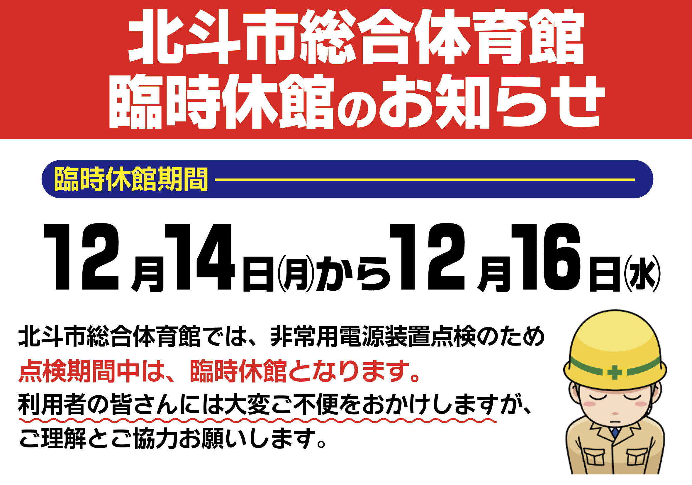 北斗市総合体育館では、非常用電源装置点検のため、 点検期間中は、臨時休館となります。 利用者の皆さんには大変ご不便をおかけしますが、ご理解とご協力お願いします。 ●内容/非常用電源装置点検